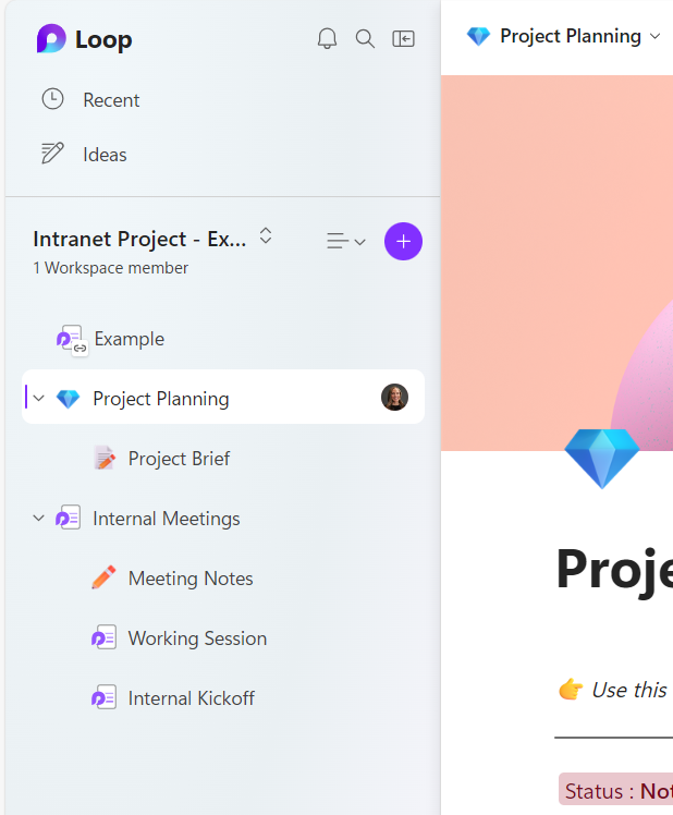 At the structure level, Loop has what are called “workspaces.” This is similar to “a team” in Teams. We’ve decided to structure our Loop Workspaces to mirror our teams in MS Teams. The structure we use is one workspace per project/initiative. This allows us to easily add our internal team members to the workspace depending on which projects they are working on. Having one workspace with organized nested pages all in one place is a lifesaver.