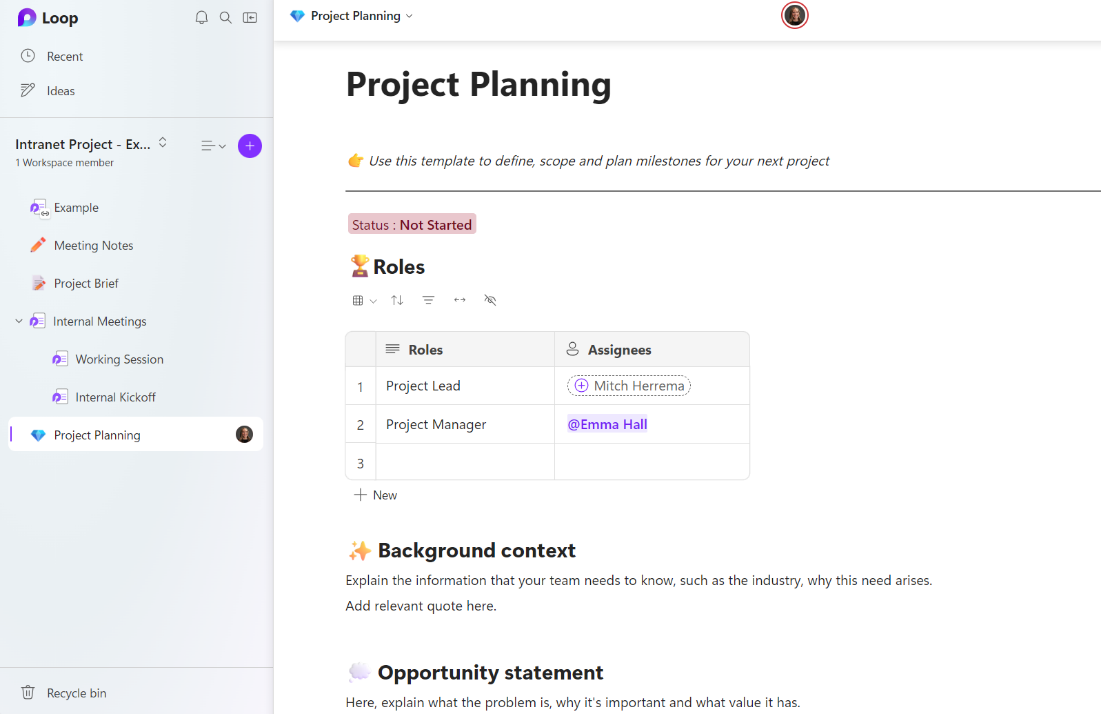 When you create a page, Loop give you the option to choose a page template that pre-fills the page with placeholders and outlines. The template I’ve been using most often is the “Project Planning” template that creates a project outline that helps you: define, scope and plan milestones for your project. Using the template helps makes sure no detail falls through the cracks. I’ve found it incredibly powerful to fill out a “Project Planning” outline before a kickoff and aligning with all of my team members on the overall Project Plan before we dive into the kickoff of a project. This is a great jumping off point in case there is any misalignment between team members.